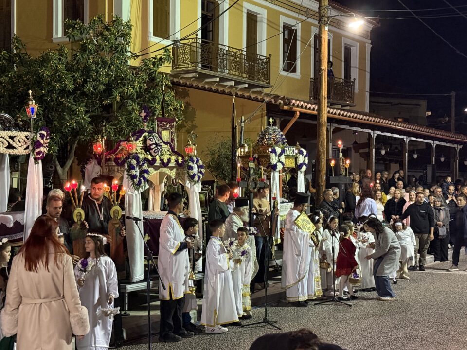 Σε κλίμα βαθιάς κατάνυξης πραγματοποιήθηκε το βράδυ της Μεγάλης Παρασκευής στο Λεωνίδιο η καθιερωμένη συνάντηση των Επιταφίων στο Ηρώο του χωριού, παρουσία πλήθους πιστών.