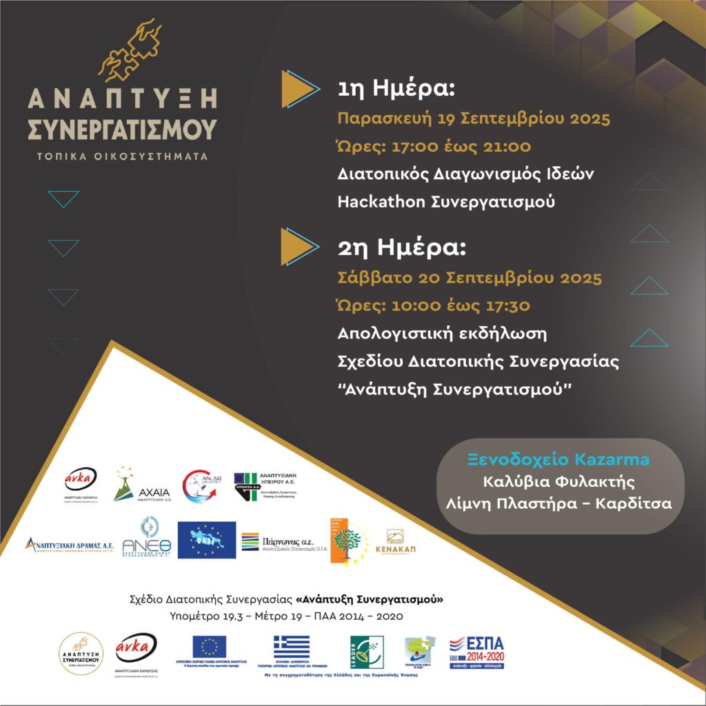 Στις 19 και 20 Σεπτεμβρίου 2025 θα πραγματοποιηθεί στη Λίμνη Πλαστήρα Καρδίτσας ο Διατοπικός Διαγωνισμός Ιδεών – Hackathon Συνεργατισμού καθώς και η Κεντρική Εκδήλωση Απολογισμού, στο πλαίσιο του Σχεδίου Διατοπικής Συνεργασίας «Ανάπτυξη Συνεργατισμού» του προγράμματος LEADER – ΠΑΑ 2014-2020.