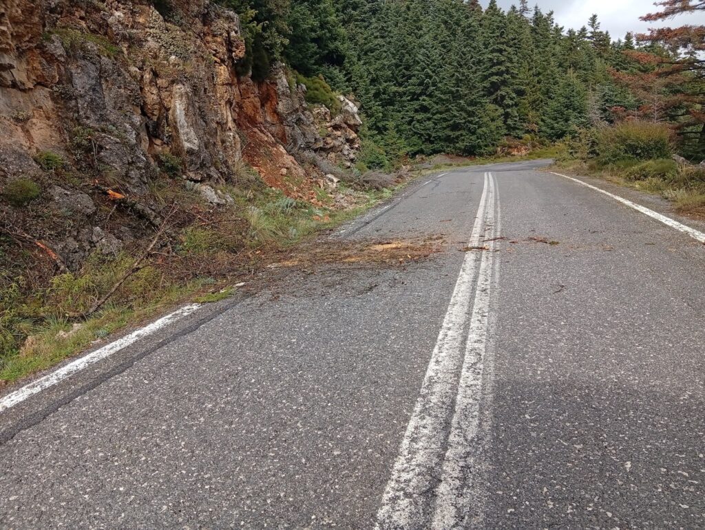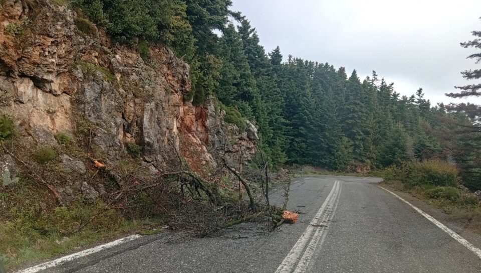Σύμφωνα με την ανάρτηση, ισχυροί άνεμοι προκάλεσαν την πτώση ενός ξερoύ κορμού ελάτου στον δρόμο, δημιουργώντας κίνδυνο για τα διερχόμενα οχήματα.