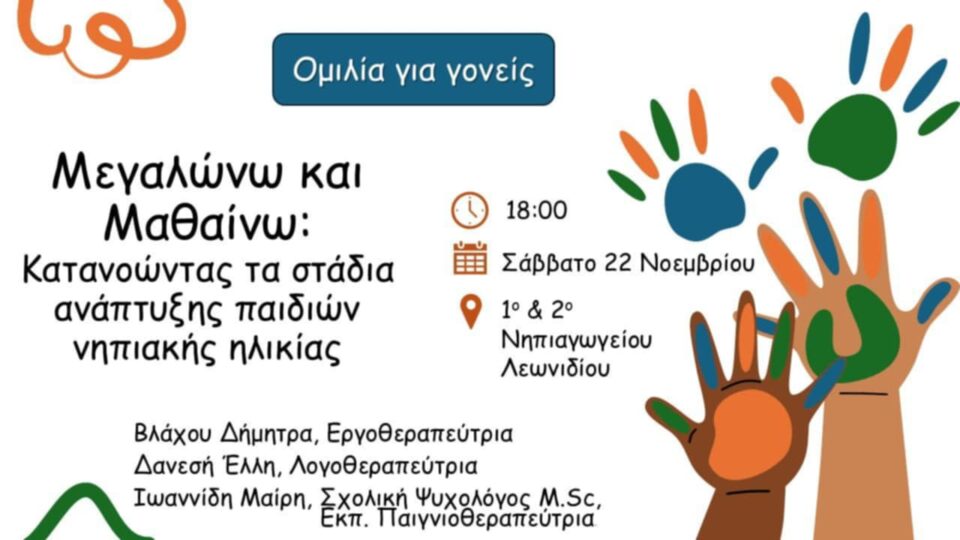 Η προσχολική ηλικία αποτελεί μία από τις πιο κρίσιμες περιόδους στη ζωή κάθε παιδιού, καθώς τότε τίθενται τα θεμέλια για τη συναισθηματική, κοινωνική, γλωσσική και γνωστική του ανάπτυξη. Με στόχο να υποστηριχθούν οι γονείς σε αυτό το ταξίδι, πραγματοποιείται η ομιλία «Μεγαλώνω και Μαθαίνω: Κατανοώντας τα στάδια ανάπτυξης παιδιών νηπιακής ηλικίας», το Σάββατο 22 Νοεμβρίου, στις 18:00, στο 1ο & 2ο Νηπιαγωγείο Λεωνιδίου.