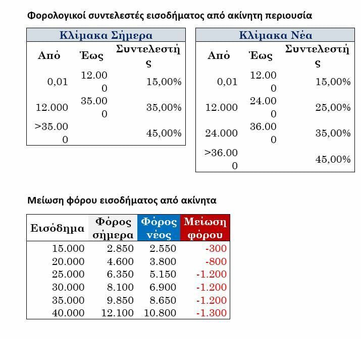 Από το φορολογικό έτος 2026 θεσπίζεται ενδιάμεσος συντελεστής 25% για εισόδημα από ενοίκια από 12.000 έως 24.000 ευρώ. Υπενθυμίζεται ότι σήμερα έως τα 12.000 εφαρμόζεται συντελεστής 15% και στη συνέχεια αυξάνεται σε 35%. Άμεσα ωφελούμενοι εκτιμώνται σε 161.587 ιδιοκτήτες ακινήτων, ωστόσο αυτό το μέτρο αναμένεται να λειτουργήσει θετικά για τη φορολογική συμμόρφωση και τη συγκράτηση των τιμών των ενοικίων. Το δημοσιονομικό κόστος εκτιμάται σε 90 εκατ. ευρώ ετησίως που θα επιβαρύνει τα έτη 2027 και επόμενα.