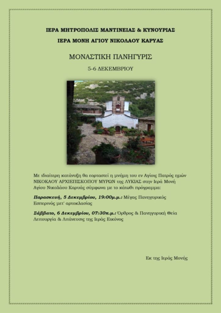Η Ιερά Μητρόπολις Μαντινείας & Κυνουρίας και η Ιερά Μονή Αγίου Νικολάου Καρυάς ανακοινώνουν τη Μοναστική Πανήγυρι που θα πραγματοποιηθεί στις 5 και 6 Δεκεμβρίου.