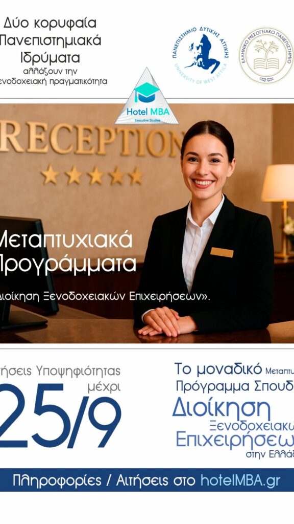 Η προθεσμία για την υποβολή υποψηφιοτήτων λήγει στις 25 Σεπτεμβρίου, ενώ περισσότερες πληροφορίες και αιτήσεις γίνονται μέσω της πλατφόρμας hotelMBA.gr.