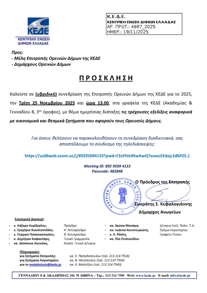Η Επιτροπή Ορεινών Δήμων της Κεντρικής Ένωσης Δήμων Ελλάδας (ΚΕΔΕ) πραγματοποίησε υβριδική συνεδρίαση την Τρίτη 25 Νοεμβρίου 2025, στα κεντρικά γραφεία της Ένωσης στην Αθήνα. Στο επίκεντρο βρέθηκαν οι τρέχουσες εξελίξεις που αφορούν κρίσιμα οικονομικά και θεσμικά ζητήματα των ορεινών δήμων της χώρας.