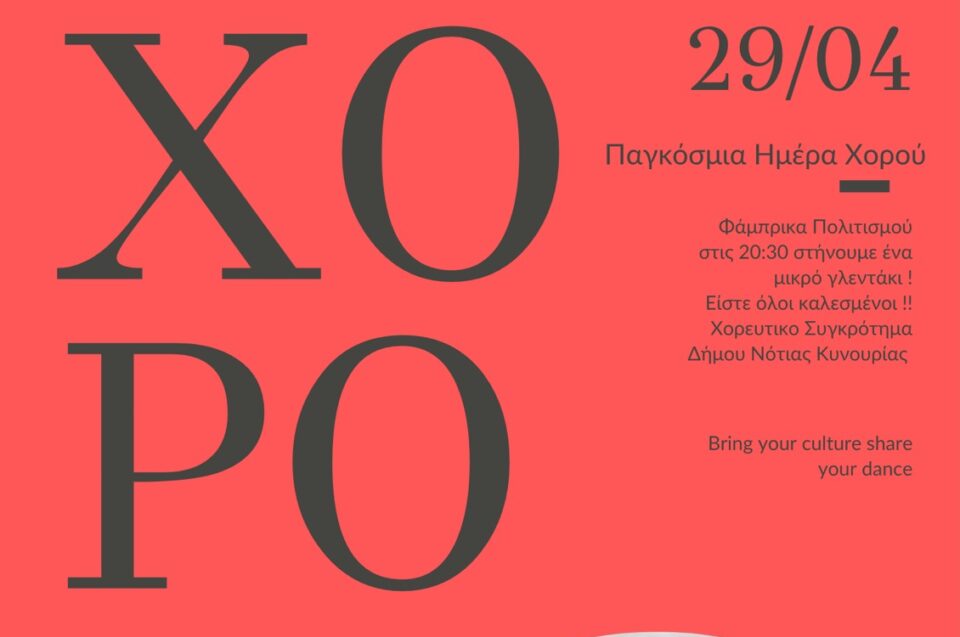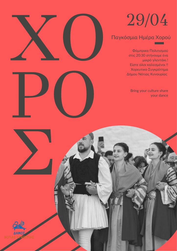 Με αφορμή την Παγκόσμια Ημέρα Χορού, ο Δήμος Νότιας Κυνουρίας καλεί κατοίκους και επισκέπτες να συμμετάσχουν σε μια ξεχωριστή γιορτή γεμάτη ρυθμό, κέφι και θετική διάθεση. Η εκδήλωση αποτελεί μια ευκαιρία για μικρούς και μεγάλους να έρθουν πιο κοντά μέσα από τη δύναμη της μουσικής και της κίνησης, αναδεικνύοντας την αξία του χορού ως μέσο έκφρασης και επικοινωνίας.