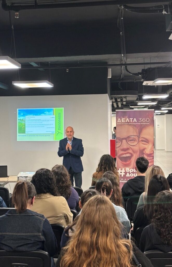 Ο Τριαντάφυλλος Σωτηρόπουλος, Υπεύθυνος Επικοινωνίας του ΚΑΑ Παλλάδιον, παρουσίασε το συνολικό προφίλ του Κέντρου, μεταφέροντας το όραμα της διοίκησης και τονίζοντας την αξία της διεπιστημονικής ομάδας που λειτουργεί αρμονικά τα τελευταία 12 χρόνια, φέρνοντας θεαματικά και μετρήσιμα αποτελέσματα στην αποκατάσταση των ασθενών. Η παρουσίασή του ανέδειξε τον συντονισμένο τρόπο με τον οποίο οι διαφορετικές ειδικότητες συνεργάζονται, επιτρέποντας στους σπουδαστές να αντιληφθούν τη σημασία της ολοκληρωμένης προσέγγισης στην υγεία και την αποκατάσταση.