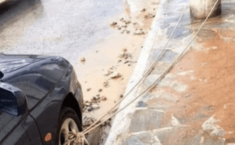 Λίγο πριν οι ουρανοί ανοίξουν και τα νερά ξεχυθούν στους δρόμους (όπως δυστυχώς συμβαίνει συχνά), έδεσε το αυτοκίνητό του με σκοινί σε κολόνα πεζοδρομίου, για να μην το παρασύρει κανένας απρόσκλητος χείμαρρος.