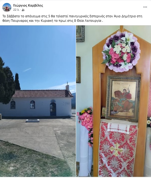 Το Σάββατο 25 Οκτωβρίου στις 17:00 το απόγευμα θα τελεστεί πανηγυρικός Εσπερινός στον Ιερό Ναό Αγίου Δημητρίου στη θέση Πουρνάρος, ενώ την Κυριακή 26 Οκτωβρίου το πρωί στις 8:00 θα ακολουθήσει η Πανηγυρική Θεία Λειτουργία προς τιμήν του Αγίου Μεγαλομάρτυρος Δημητρίου.
