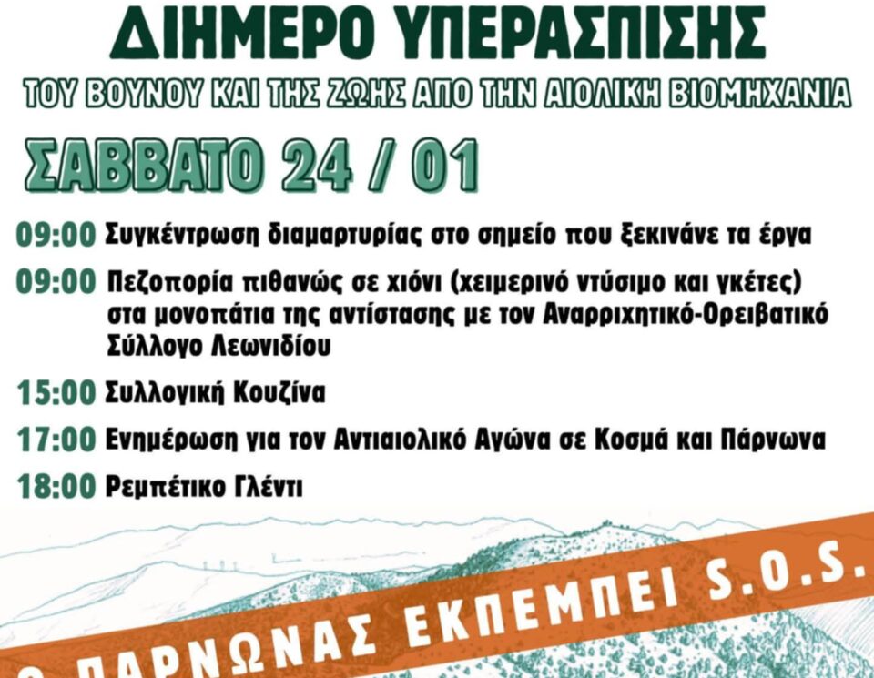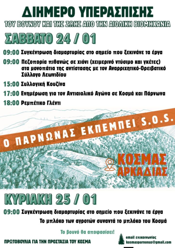 Διήμερο δράσεων και κινητοποιήσεων οργανώνεται το Σάββατο 24 και την Κυριακή 25 Ιανουαρίου στον Πάρνωνα, με επίκεντρο τον Κοσμά Αρκαδίας, ενάντια στην επέκταση των αιολικών εγκαταστάσεων στην περιοχή.