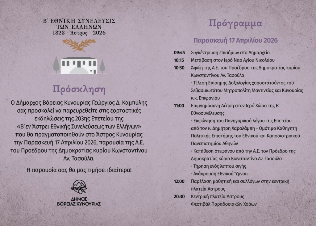 Την Παρασκευή 17 Απριλίου κορυφώνονται οι εκδηλώσεις για τον εορτασμό της επετείου 203 χρόνων από τη Σύγκληση της Β΄ Εθνοσυνέλευσης του 1823, παρουσία της Α.Ε. του Προέδρου της Δημοκρατίας κυρίου Κωνσταντίνου Αν. Τασούλα.