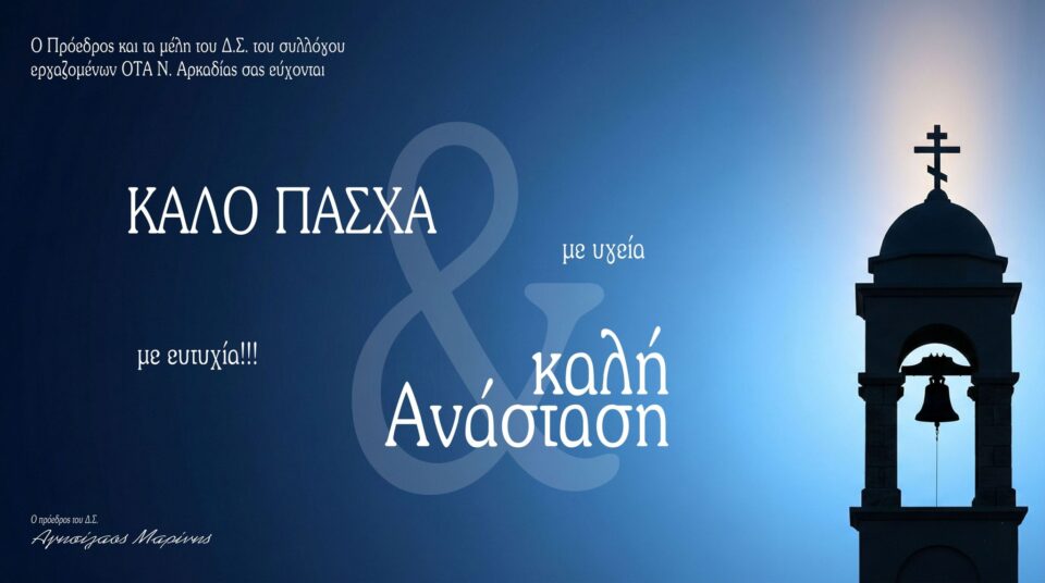 Τις θερμές τους ευχές για το Πάσχα απευθύνουν ο Πρόεδρος και τα μέλη του Διοικητικού Συμβουλίου του Συλλόγου Εργαζομένων ΟΤΑ Νομού Αρκαδίας, ευχόμενοι σε όλους υγεία, ευτυχία και Καλή Ανάσταση.