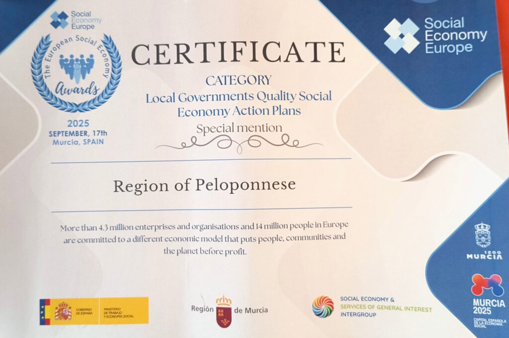 Τιμητική Διάκριση για την Περιφέρεια Πελοποννήσου στα European Social Economy Awards 2025