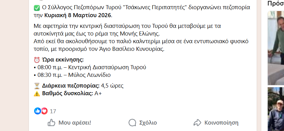 Μια όμορφη πεζοπορική διαδρομή μέσα στη φύση του Πάρνωνα διοργανώνει την Κυριακή 8 Μαρτίου 2026 ο Σύλλογος Πεζοπόρων Τυρού «Τσάκωνες Περιπατητές», καλώντας φίλους της πεζοπορίας και της φύσης να συμμετάσχουν σε μια ξεχωριστή εμπειρία.