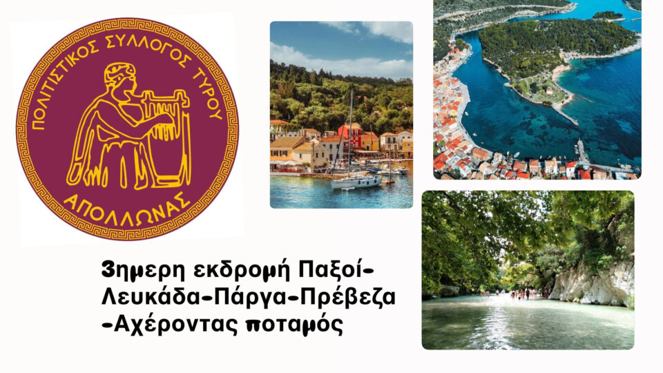 Ο Πολιτιστικός Σύλλογος Τυρού οργανώνει μια συναρπαστική 3ήμερη εκδρομή σε μερικούς από τους πιο μαγευτικούς προορισμούς της Δυτικής Ελλάδας και της Ηπείρου: Παξοί, Λευκάδα, Πάργα, Πρέβεζα και Αχέροντα ποταμό.