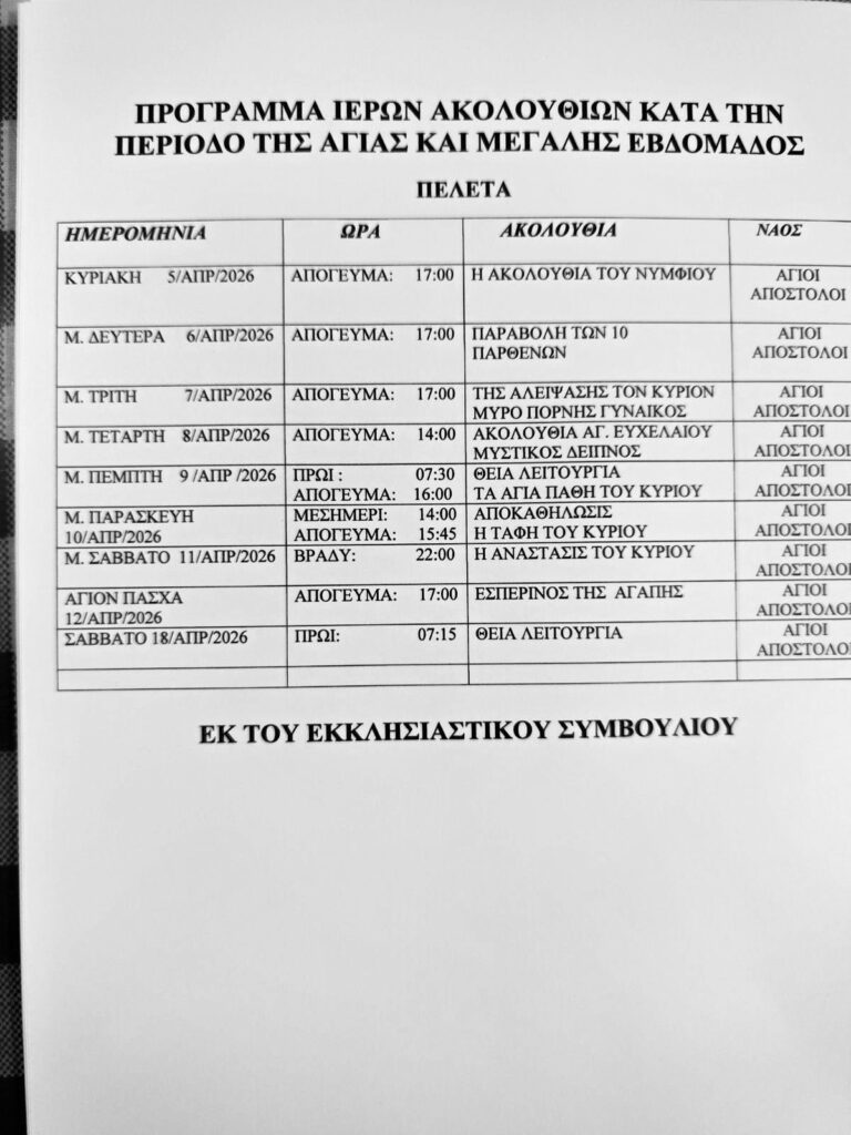 Το πρόγραμμα των Ιερών Ακολουθιών για την περίοδο της Αγίας και Μεγάλης Εβδομάδας ανακοίνωσε η Ενορία Αγίων Αποστόλων Πελετών στη Νότια Κυνουρία.