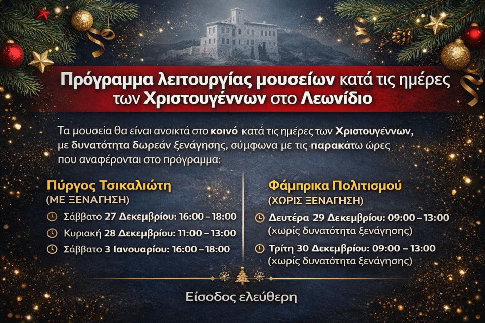 Τρίτη 30 Δεκεμβρίου: 09:00 – 13:00 (χωρίς δυνατότητα ξενάγησης)