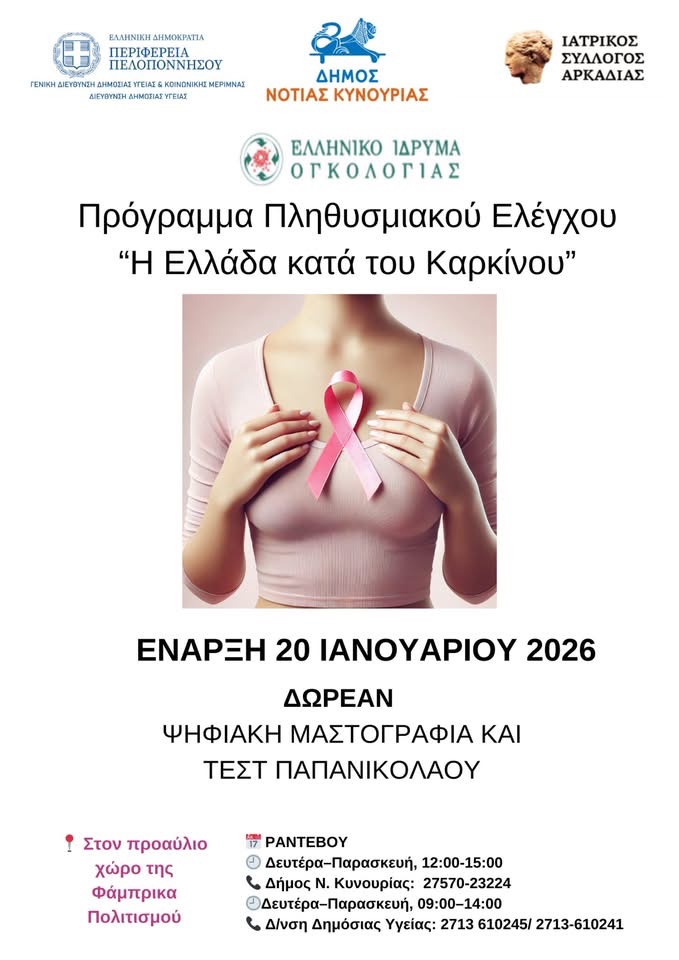 Με ιδιαίτερη χαρά σας πληροφορούμε, ότι στο πλαίσιο του προγράμματος «Η ΕΛΛΑΔΑ ΚΑΤΑ ΤΟΥ ΚΑΡΚΙΝΟΥ», το «ΕΛΛΗΝΙΚΟ ΙΔΡΥΜΑ ΟΓΚΟΛΟΓΙΑΣ», μετά από αίτημα του Δήμου Ν. Κυνουρίας και την έγκριση του Ιατρικού Συλλόγου Αρκαδίας, ξεκινά για τρίτη φορά (3η φάση εξετάσεων) πρόγραμμα πληθυσμιακού ελέγχου για την πρόληψη και έγκαιρη διάγνωση των κακοηθών όγκων μαστού και τραχήλου της μήτρας, στις γυναίκες που κατοικούν μόνιμα στον Δήμο Ν. Κυνουρίας.