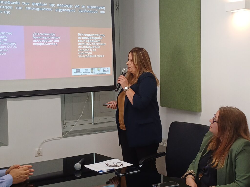 Στη συνέχεια μίλησαν η Μαρίνα Τριτάκη, Προϊσταμένη Τεχνικών Υπηρεσιών, η Σόφη Μουτάφη, συνεργάτιδα της Εταιρείας, καθώς και η Πολυξένη Μένη, Αναπληρώτρια Γενική Διευθύντρια Οικονομικών και Συγχρηματοδοτούμενων Προγραμμάτων, η οποία ανέδειξε τον ρόλο της ΟΤΔ και τη σημασία του συντονισμού στην επιτυχή υλοποίηση του προγράμματος.