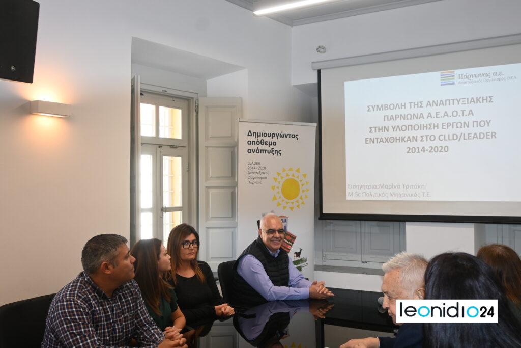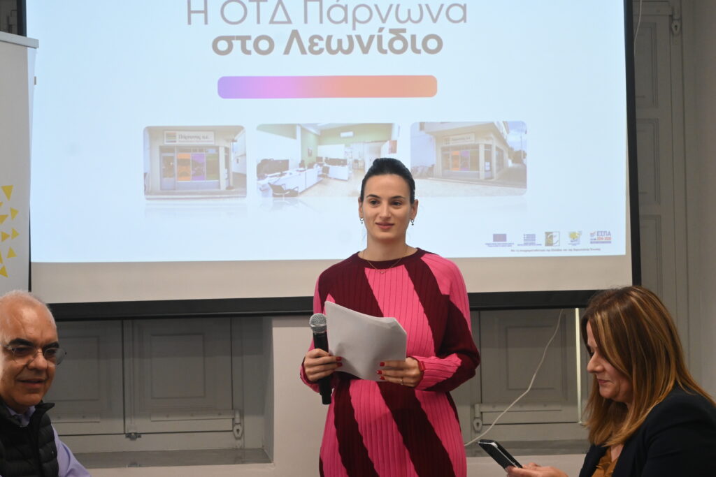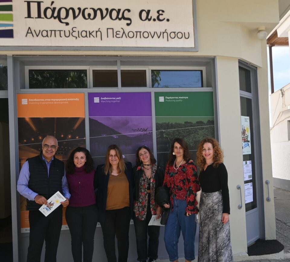 Ακολούθησε μετάβαση στα Κεντρικά Γραφεία της Αναπτυξιακής Πάρνωνα στο Λεωνίδιο. Από τις 12:15 έως τις 12:30 παρουσιάστηκε η ΟΤΔ Πάρνωνα και πραγματοποιήθηκε ξενάγηση στους χώρους από την Πολυξένη Μένη, Αναπληρώτρια Γενική Διευθύντρια Οικονομικών και Συγχρηματοδοτούμενων Προγραμμάτων.