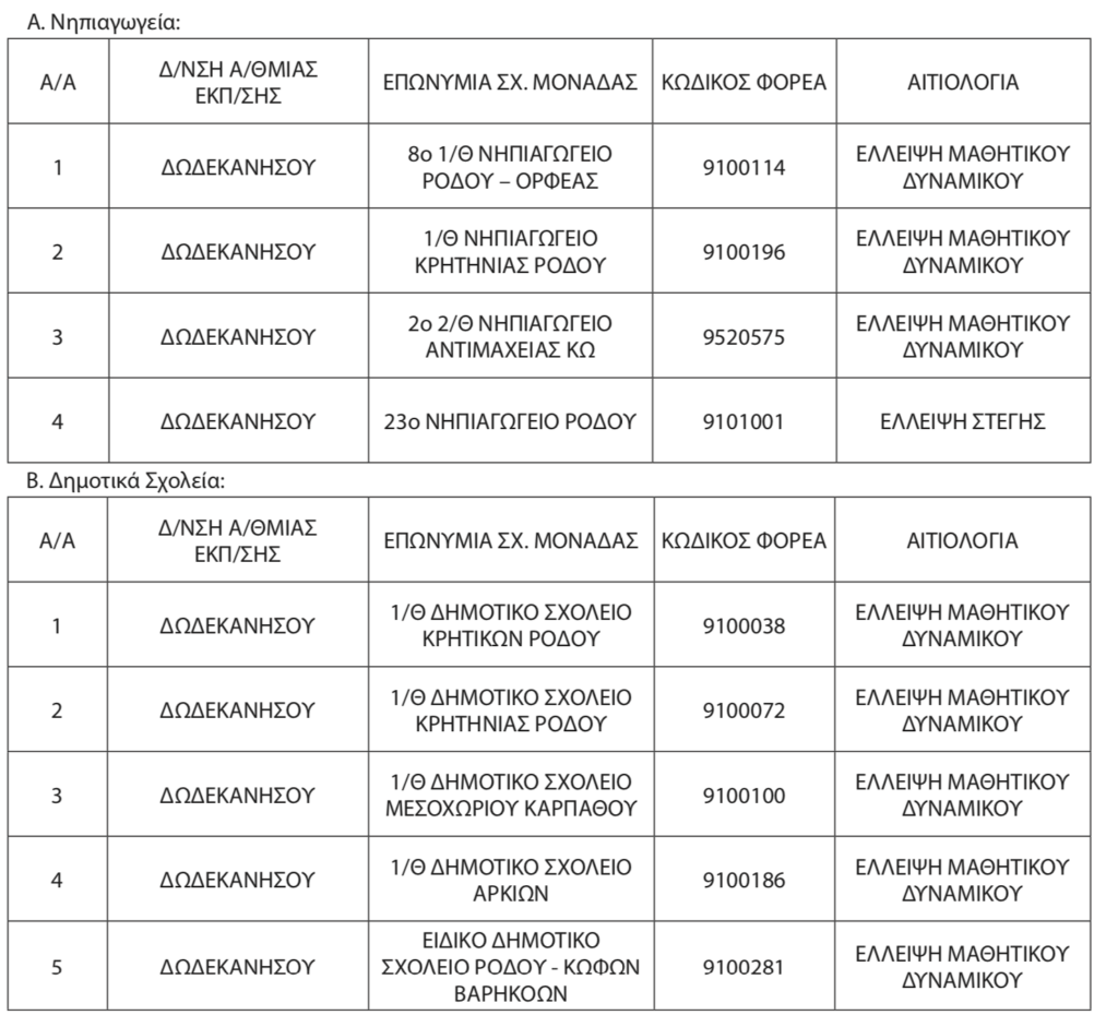 Αναστέλλεται η λειτουργία 4 Νηπιαγωγείων και 5 Δημοτικών Σχολείων στα Δωδεκάνησα
