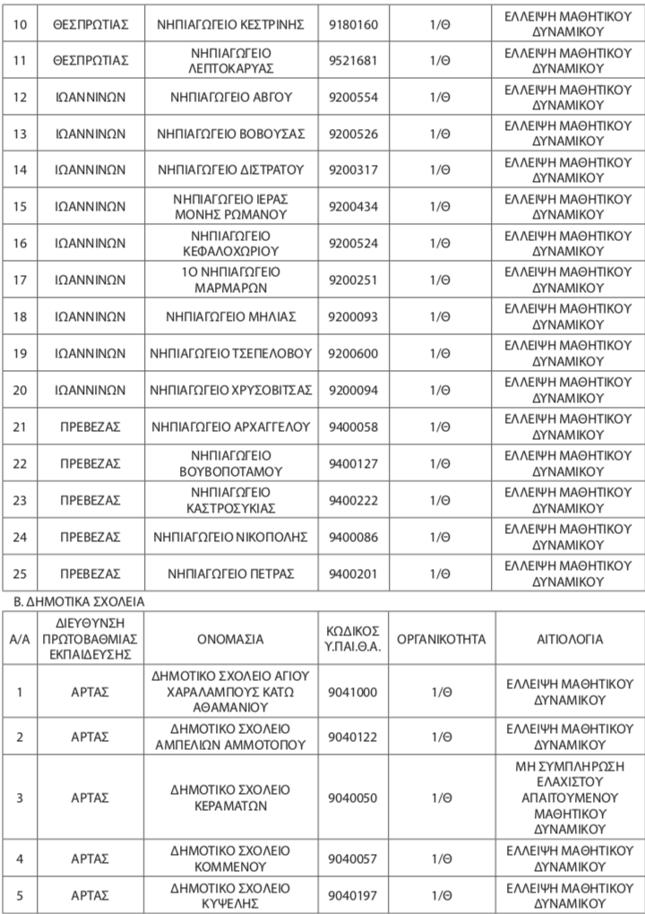 Λόγω έλλειψης μαθητών αποφασίστηκε η αναστολή λειτουργίας για τη σχολική χρονιά 2025-2026 σε 38 σχολεία Πρωτοβάθμιας εκπαίδευσης της Ηπείρου. 25 Νηπιαγωγεία και 13 Δημοτικά σχολεία και στους 4 νομούς της Περιφέρειας θα παραμείνουν κλειστά λόγω έλλειψης μαθητών, δεν συγκεντρώνουν δηλαδή τον επαρκή αριθμό μαθητών, ή δεν έχουν καθόλου μαθητές. Η απόφαση πάρθηκε από την Περιφερειακή Διεύθυνση Εκπαίδευσης Ηπείρου, μετά από σχετικές εισηγήσεις των Διευθύνσεων Εκπαίδευσης των τεσσάρων Νομών.