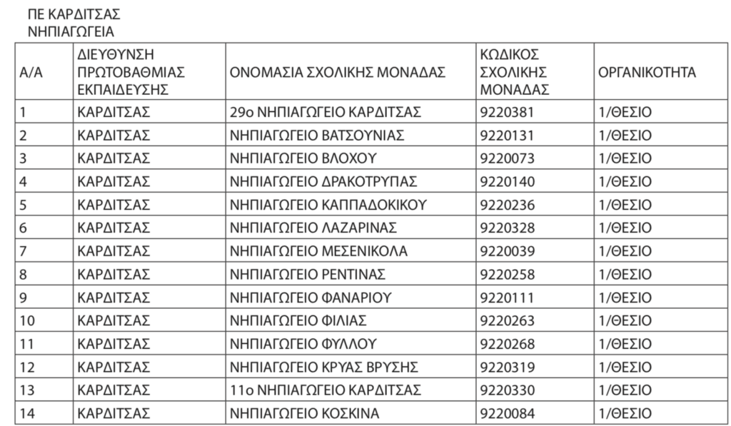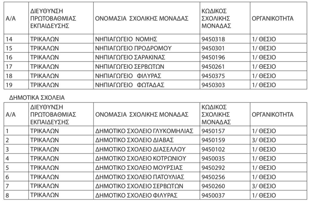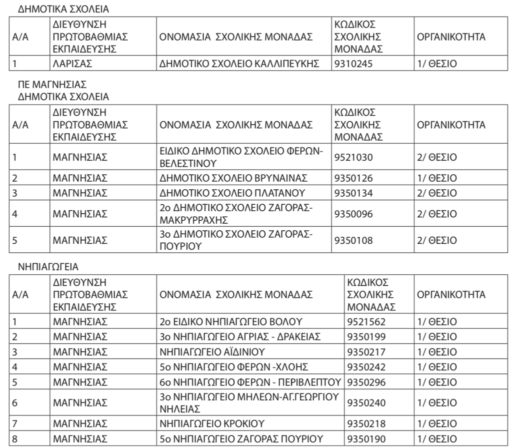 Αναστέλλεται η λειτουργία 54 Νηπιαγωγείων και 20 Δημοτικών Σχολείων στους Νομούς Καρδίτσας, Λάρισας, Μαγνησίας και Τρικάλων, για το σχ. έτος 2025-26, κυρίως λόγω έλλειψης μαθητών/τριών, με απόφαση της Αναπληρώτριας Περιφερειακής Διευθύντριας Β. Ζιάκα.Ειδικότερα πρόκειται για τις ακόλουθες σχολικές μονάδες: