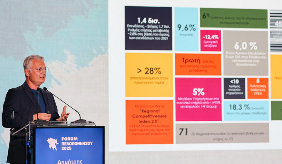 Στη συνέχεια, παρουσίασε την πραγματική εικόνα της Πελοποννήσου μέσα από κρίσιμους δείκτες όπως η ανταγωνιστικότητα και παραγωγικότητα, το αγροτικό δυναμικό, τα ελλειμματικά έργα άρδευσης και αντιπλημμυρικής προστασίας, καθώς και η αδύναμη παρουσία καινοτομίας και έρευνας. Όπως επεσήμανε, αυτή η αποτύπωση δεν γίνεται για να καταγράψει απλώς τα προβλήματα, αλλά για να καθοδηγήσει πολιτικές με πραγματικό και μετρήσιμο αποτέλεσμα.