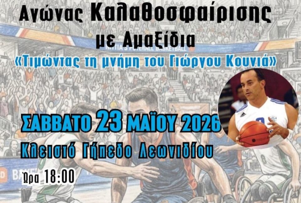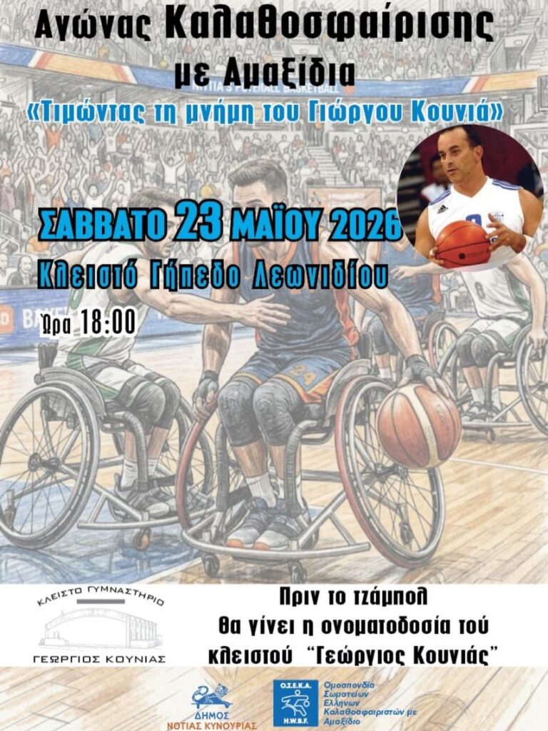 Με στόχο την τιμή και τη διατήρηση της μνήμης του Γιώργου Κουνιά, ο Δήμος Νότιας Κυνουρίας διοργανώνει αγώνα καλαθοσφαίρισης με αμαξίδιο στο Κλειστό Γυμναστήριο Λεωνιδίου. Η εκδήλωση αναμένεται να συγκεντρώσει πλήθος κόσμου, σε μια ιδιαίτερα συμβολική και συγκινητική βραδιά για την τοπική κοινωνία.