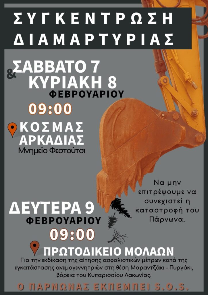 Σε διήμερη συγκέντρωση διαμαρτυρίας στον Κοσμά Αρκαδίας καλούνται πολίτες και συλλογικότητες το Σάββατο 7 και την Κυριακή 8 Φεβρουαρίου, με σημείο συνάντησης το Μνημείο Φεστούτι και ώρα έναρξης τις 09:00. Η κινητοποίηση πραγματοποιείται στο πλαίσιο της αντίδρασης απέναντι στη συνέχιση των εργασιών εγκατάστασης ανεμογεννητριών στον Πάρνωνα.