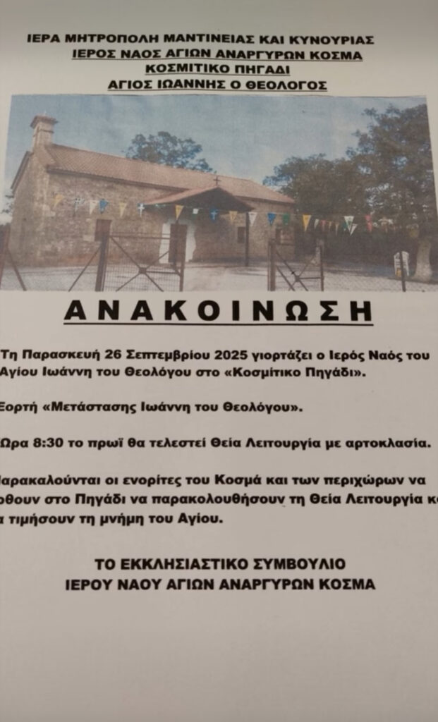 Την Παρασκευή 26 Σεπτεμβρίου το πρωί στις 8:00, θα τελεστεί Θεία Λειτουργία στον Ιερό Ναό του Αγίου Ιωάννη του Θεολόγου, στην τοποθεσία «Κοσμητικό Πηγάδι».