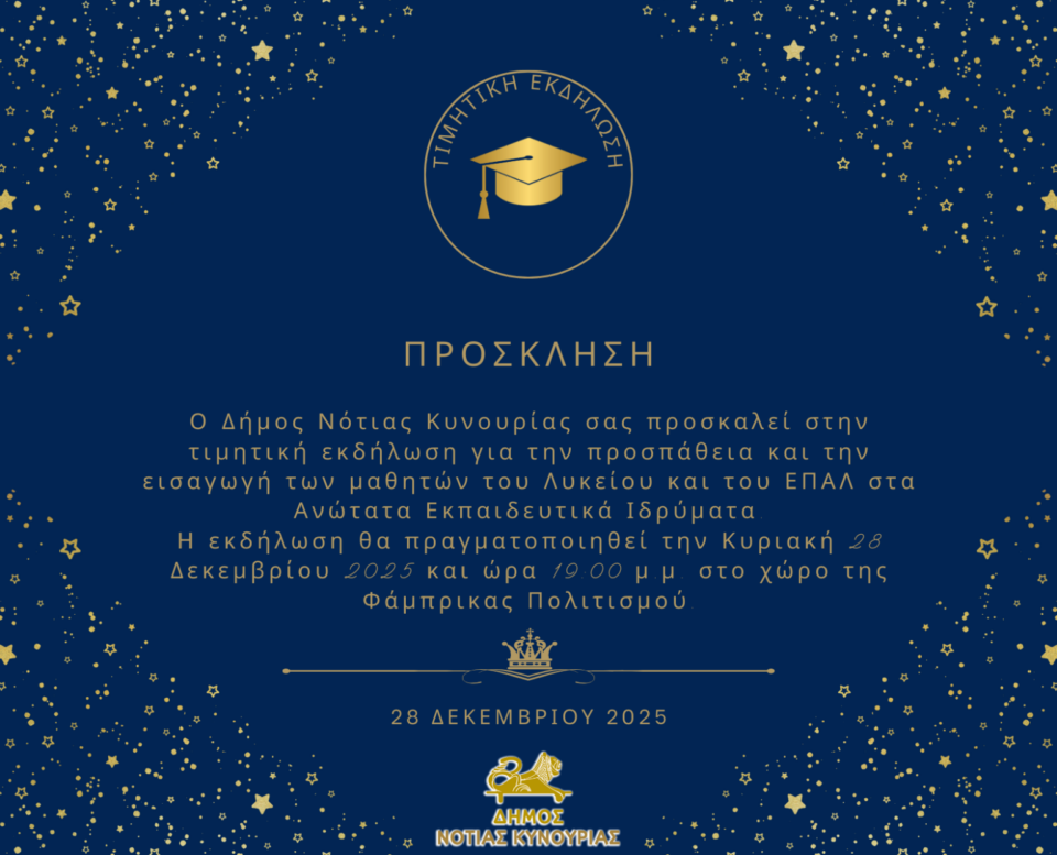 Ο Δήμος Νότιας Κυνουρίας διοργανώνει εκδήλωση βράβευσης για την προσπάθεια και την εισαγωγή των μαθητών και μαθητριών του Γενικού και του Επαγγελματικού Λυκείου του Δήμου μας, οι οποίοι έδωσαν εξετάσεις κατά το σχολικό έτος έτος 2024-2025 και αρκετοί πέτυχαν την εισαγωγή τους σε Ανώτατα και Ανώτερα Εκπαιδευτικά Ιδρύματα της χώρας.