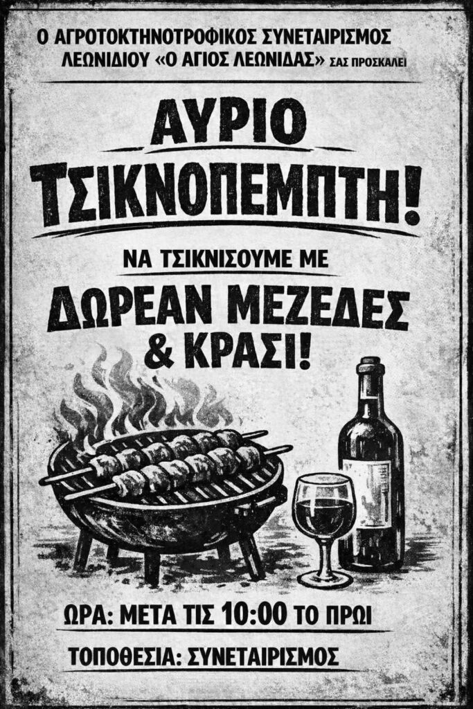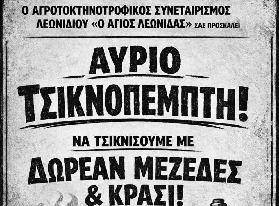 Σε αποκριάτικους ρυθμούς μπαίνει το Λεωνίδιο, με τον Αγροτοκτηνοτροφικό Συνεταιρισμό Λεωνιδίου «Ο Άγιος Λεωνίδας» να απευθύνει ανοιχτό κάλεσμα για τον εορτασμό της Τσικνοπέμπτης.