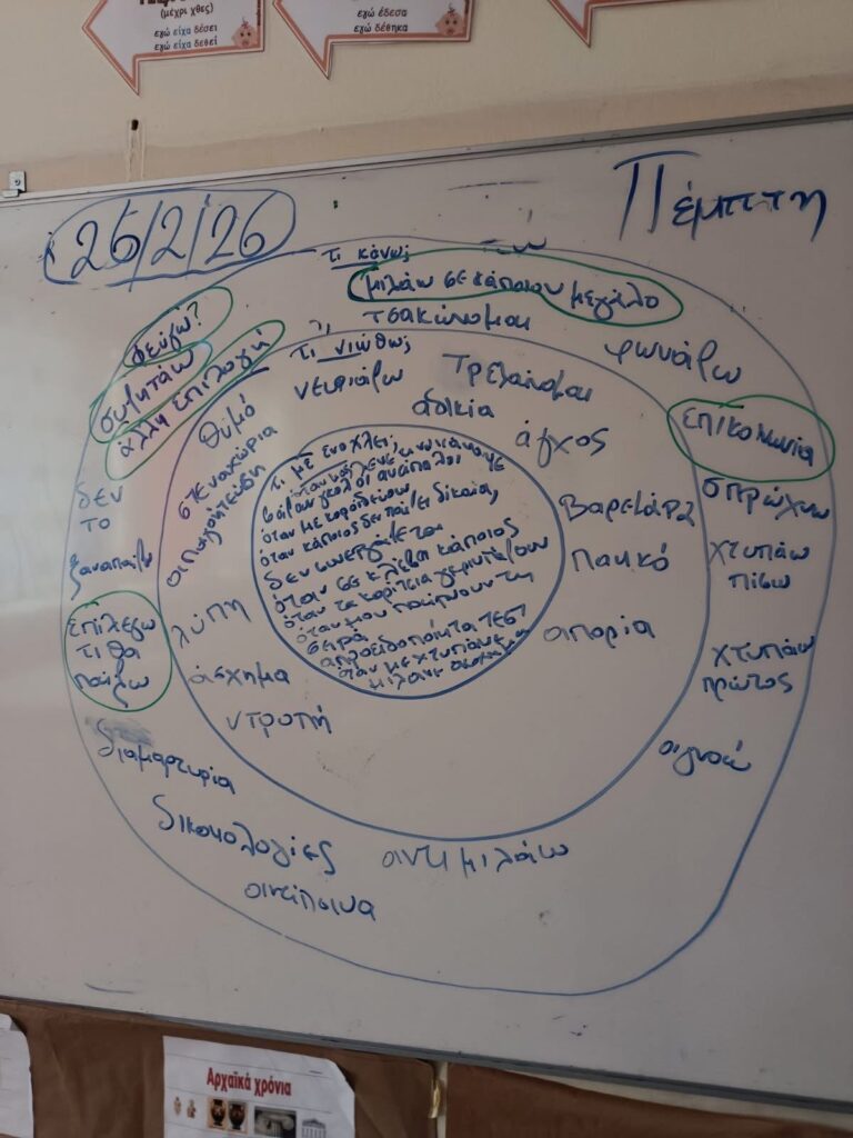 Η δράση είχε στόχο την ενίσχυση των κοινωνικών και συναισθηματικών δεξιοτήτων των μαθητών/μαθητριών, καθώς και την καλλιέργεια θετικού και υποστηρικτικού κλίματος στην τάξη. Μέσα από βιωματικές δραστηριότητες, τα παιδιά αναγνώρισαν καταστάσεις που τους προκαλούν θυμό ή αναστάτωση, κατανόησαν τη σύνδεση σκέψεων και συναισθημάτων και συζήτησαν αποδεκτούς και αποτελεσματικούς τρόπους διαχείρισης των δυσάρεστων συναισθημάτων.