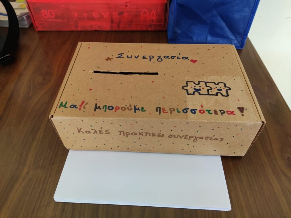 Η δράση ολοκληρώθηκε με τη δημιουργία του «Κουτιού Συνεργασίας», στο οποίο οι μαθητές/μαθήτριες θα καταγράψουν καθ’ όλη τη διάρκεια της εβδομάδας θετικά παραδείγματα συνεργατικής συμπεριφοράς.