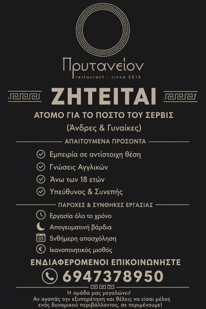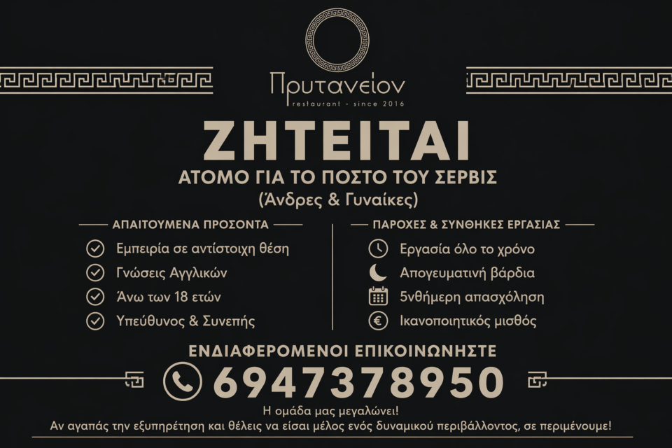 Το εστιατόριο «Πρυτανείον» στο Λεωνίδιο αναζητά άτομο για τη στελέχωση της θέσης σέρβις, στο πλαίσιο ενίσχυσης της ομάδας του.